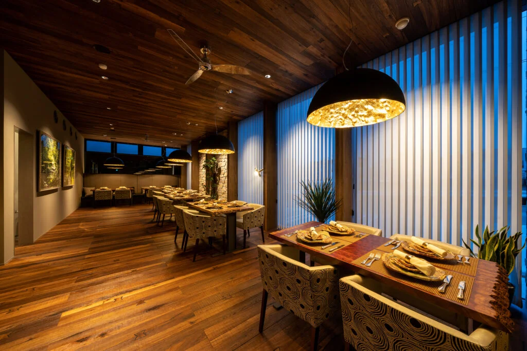 Este parquet destaca por sus mariposas incrustadas, un detalle artesanal que es su seña de identidad, aportando un toque distintivo y elegante. Con su cepillado profundo y tratamiento de aceite natural, el Margaux transforma el espacio, ofreciendo calidez y una rica variedad de tonalidades naturales. Cada elemento del diseño refleja una conexión armoniosa entre tradición y modernidad, haciendo del Katayama Grill una experiencia estética y sensorial incomparable.