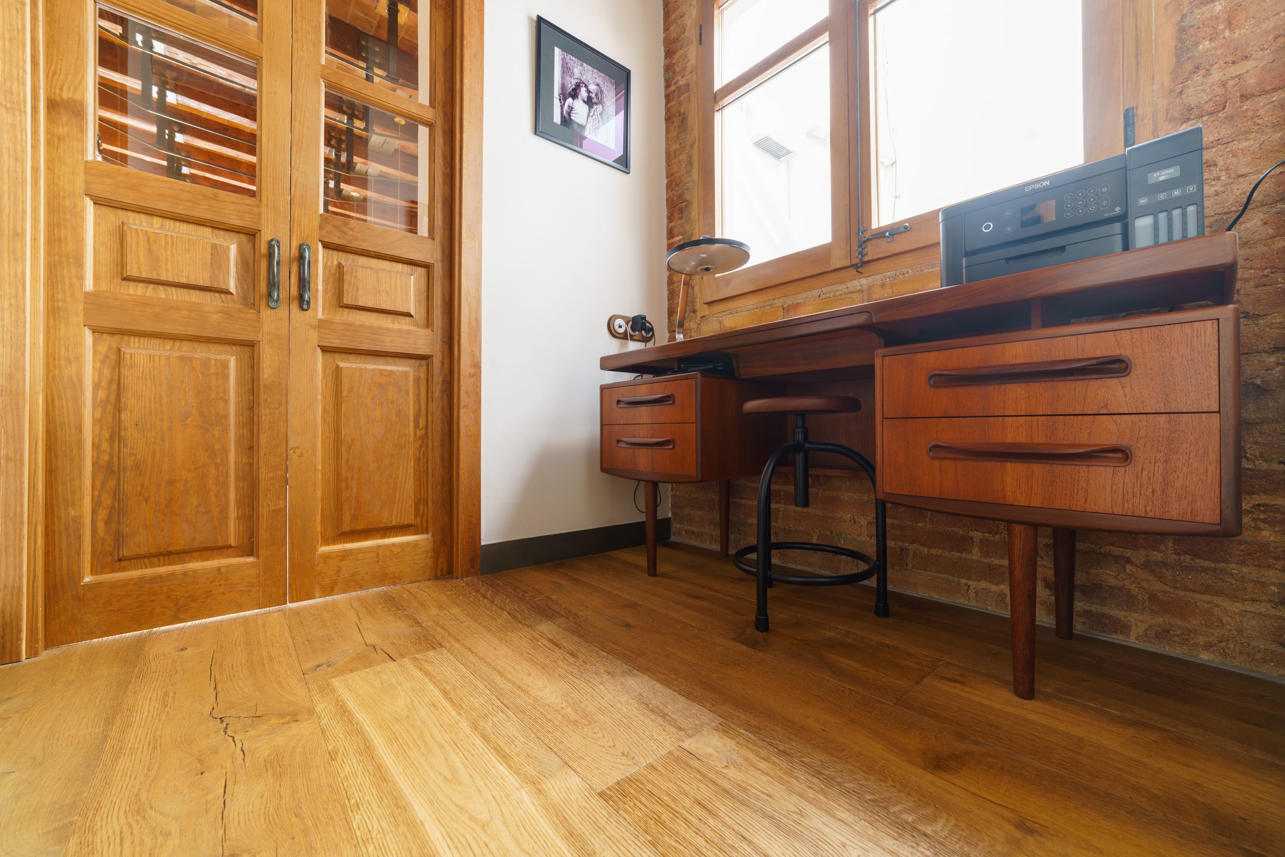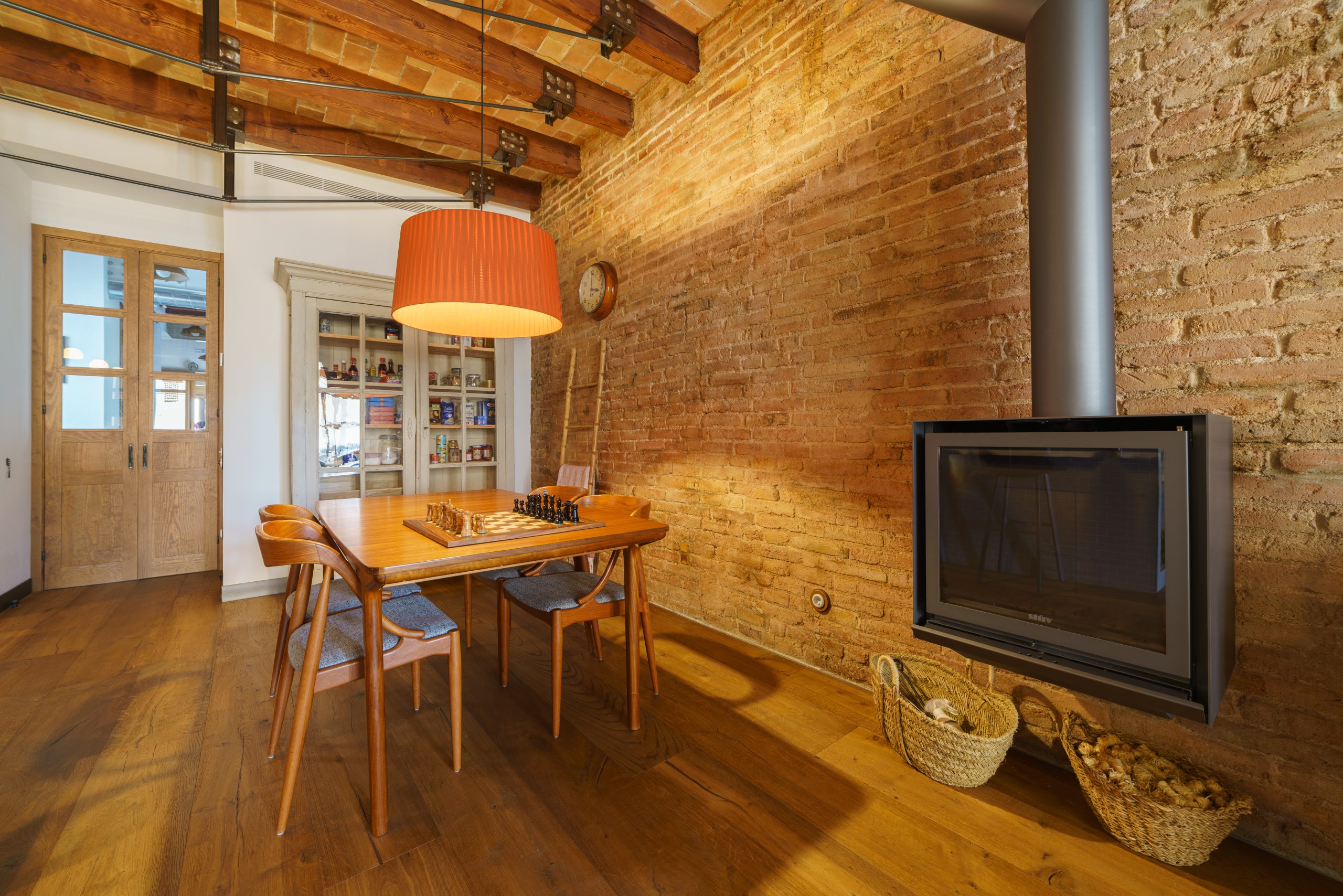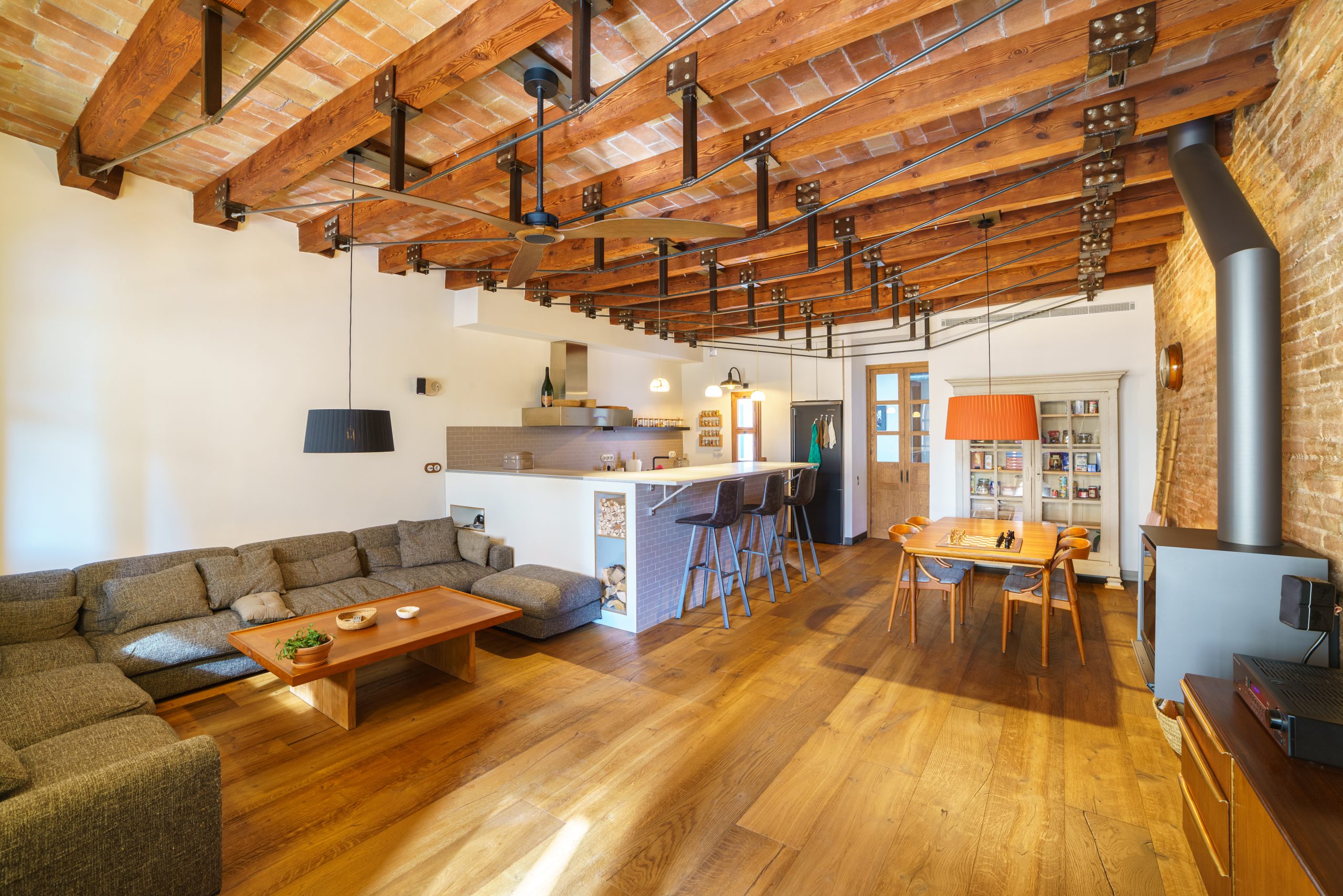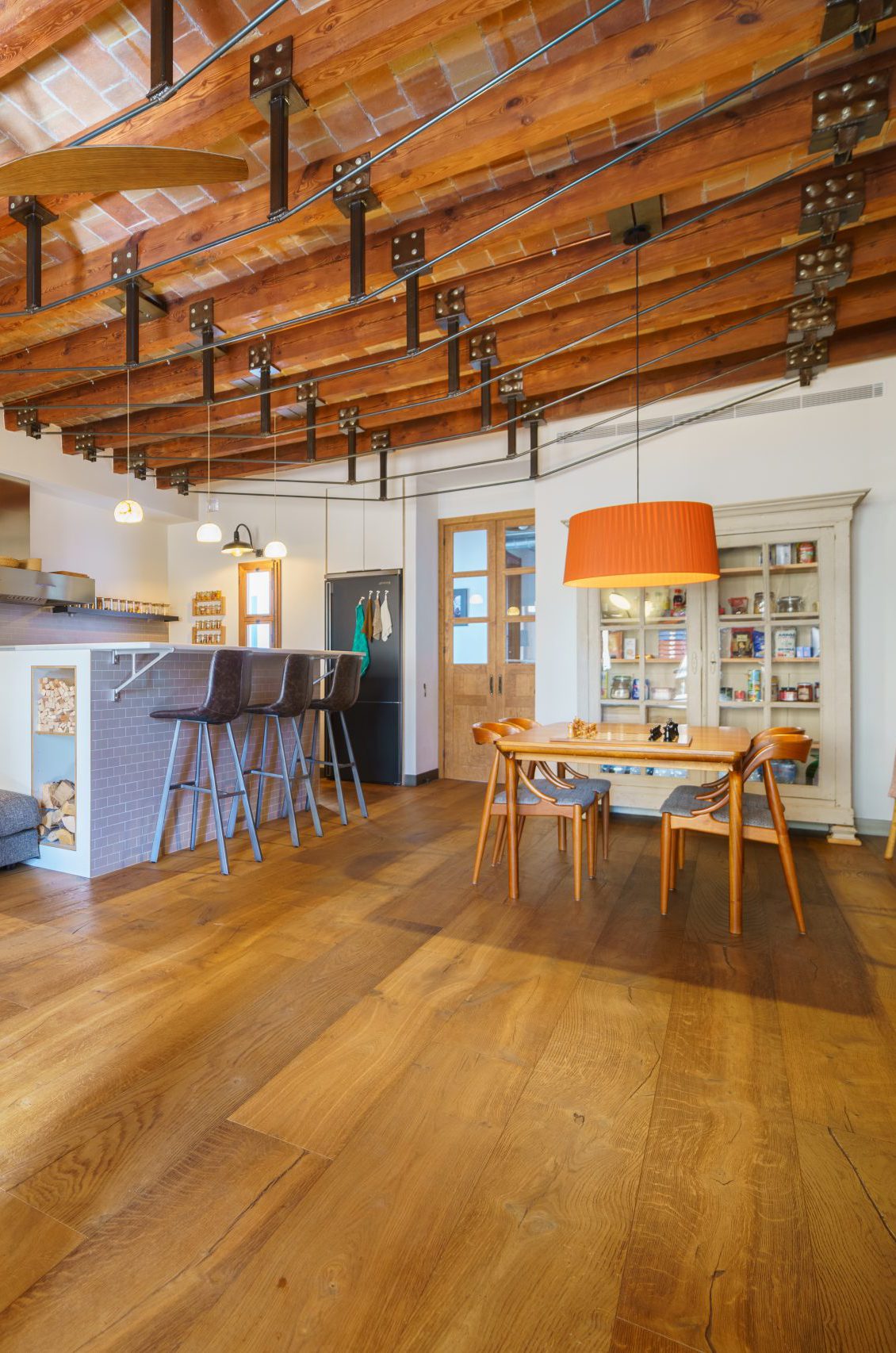 El parquet Millésime Eclano, instalado en todo el espacio, resalta en la cocina de concepto abierto con sus techos altos y vigas de madera. Las paredes de ladrillo visto, que evocan un auténtico estilo loft americano, se integran a la perfección con el carácter noble del Eclano, creando una armonía única entre la rusticidad industrial y la elegancia de la madera.